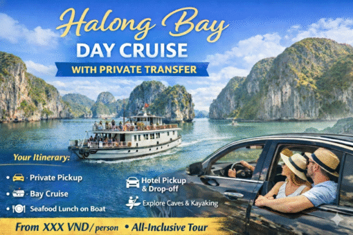 如果您在下龙湾只有一天时间,但仍希望充分体验这座联合国教科文组织世界自然遗产的壮丽景色,那么下龙湾一日游(含私人接送)将是您的理想选择。该行程非常适合国际游客、家庭、情侣及小团体,为您提供舒适、省心、高效的旅游体验。 为什么选择下龙湾一日游? 搭配私人接送服务,您无需担心交通、打车或自行寻找码头,一切安排妥当。 下龙湾一日游参考行程 🚗 11:00 – 11:30 | 私人接送 ⛴️ 12:00 – 17:30 | 下龙湾游船观光 🚗 17:45 – 18:30 | 私人专车返程 选择含私人接送...